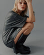 Soft cotton blend t-shirt dress accented with a small right side leg slit and an above the knee hemline.